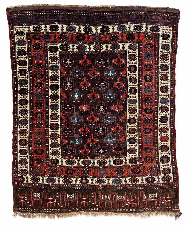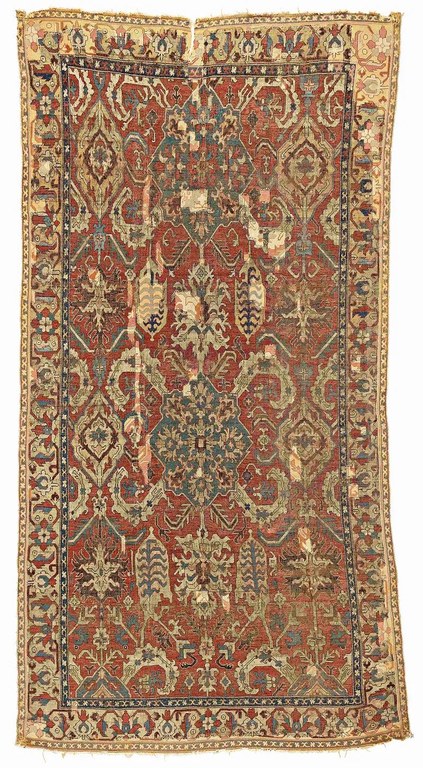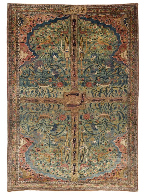 The Mashhad example would go on to be exhibited in the Burlington House exhibition in 1931 along with a select group of carpets and returned to the shrine at the close of the exhibition (Maktabi 2016, p.65). Maktabi notes that “Historically, the shrine has been off limits to non-Muslims and its treasures the stuff of legend described by those who had seen them first hand” (Maktabi 2016, p.59). The presence of this rare weave thus allows us a glimpse at its magnificent Safavid predecessor. Sotheby’s, Estimate