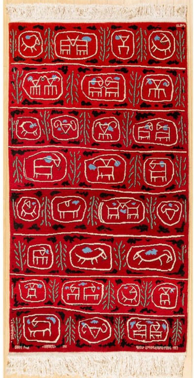 He was a faculty member at the Fine Arts Academy in Tehran and lived a nomadic life between the Soviet Union, Iran, Italy, the US, and Armenia. Grigorian studied different weaving techniques and even wove some pieces himself, combining his knowledge of traditional Armenian patterns with modern art. His approach resulted in artworks rather than conventional floor coverings.