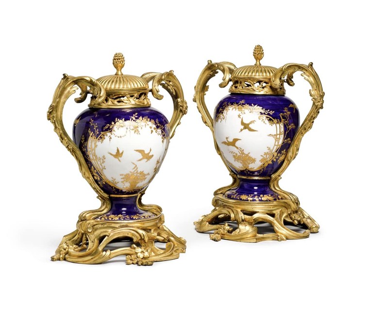 Pair of Louis XV gilt-bronze mounted Vincennes bleu lapis porcelain pots pourris and covers, the porcelain circa 1752, the mounts mid-18th century