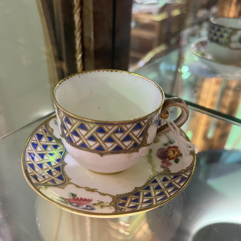 At Ghorbany Benmore we have a pristine Sèvres soft-paste porcelain tea cup and saucer, circa 1760, marked with the Sèvres mark of two interlaced L’s (for Louis XV) with letter G in middle. The pattern of trelliswork decoration was called ‘mosaïque‘ in the Sèvres manufactory’s archives.