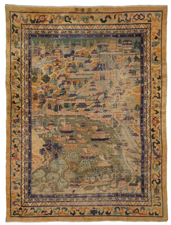 USD 10,000 – USD 15,000, The top of the rug is woven with a four-character inscription, tai miao bei yong (reserved for the use of the Ancestral Temple).